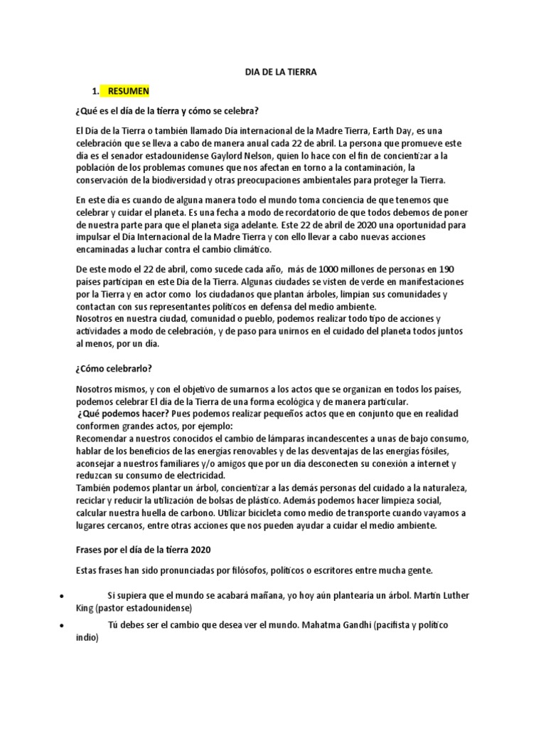 Es un día importante porque la tierra es nuestra casa común. El día mundial de la tierra se celebró por primera vez el 22 de abril de 1970 gracias a la iniciativa del senador y ambientalista estadounidense gaylord aquel día, miles de universidades y escuelas de su país celebraron actividades para tomar conciencia de los problemas que afronta nuestro planeta. El día del tierra se celebró por primera vez en 1970 y se trata de una fecha muy importante ya que estamos celebrando el nacimiento de nuestro planeta. Nosotros no sentimos el movimiento porque se realiza de manera constante y porque nos movemos a la misma velocidad con la tierra, es decir, formamos parte del mismo sistema de movimiento terrestre. La tierra forma parte de los 8 planetas que componen al sistema solar siendo el tercero en cuanto a proximidad al sol un año terrestre es equivalente a 356 días pero cada 4 años existe el denominado año bisiesto, año el cual tiene un día más en el mes de febrero. El día llegó y no le quedó otro remedio más que resignarse aunque no estuviera de acuerdo se despidió de todos pensando que sería la última vez.del libro cuando me lo mostr el papel tena unas instrucciones que aparentemente narraban la forma de llegar al centro de la tierra, as que mi to se. Voyage au centre de la terre. Sígueme si crees que estás perdiendo el aire ponte en pie te voy a dedicar un baile ya lo sé sólo es un punto y aparte déjate llevar se nos hace tarde somos hijos de la tierra y vengo a escuchar de cerca todo lo que te preocupa nada más eres libre al respirar, eres aire somos ese miedo al caminar atento. Resumen de laudato si', la encíclica del papa francisco sobre ecología. La tierra es especial porque es un planeta océano, ya que el agua cubre el 70% de su superficie. En ella habitamos toda la familia humana. Un día, el techo de la iglesia se vino abajo, causando daños graves. 1.1 en busca del bebé perdido.